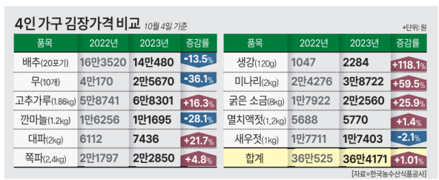 [3] 뉴시스 - "배추·무 가격 안정세라는데" 올해 김장 비용 얼마들까 (https://www.newsis.com/view/NISX20231124_0002534244)