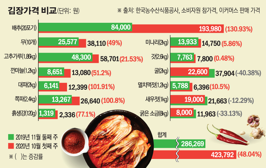 에서 보듯이, 2019년과 2020년 사이에 배추 가격이 48.04% 상승한 것을 확인할 수 있습니다. 이러한 가격 상승은 소비자들에게 큰 부담이 되고 있습니다.