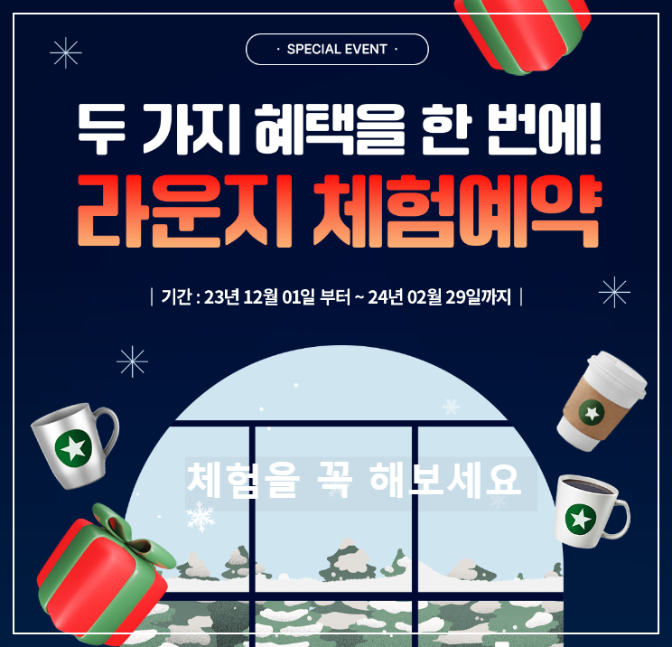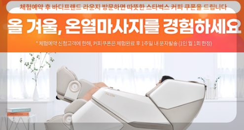 바디프랜드에서 라운지 체험예약을 실시합니다. 체험예약 후에 바디프랜드 라운지 방문 시 맛있고 따뜻한 스타벅스 커피쿠폰을 드립니다. 체험예약한 고객님께 완료 후 1주일 내 문자발송이 완료되는 점 참고하시고 꼭 이용해 보시길 바랍니다.