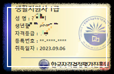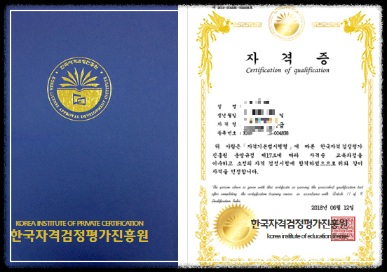 수강시작 - 진도율 60% -시험응시 60점 이상 - 자격증발급신청 - 협회심사과정 - 자격증발급완료 과정으로 자격증취득이 진행됩니다. 한국직업능력 연구원의 정식 등록된 민간자격증으로 공식협회에서 발급번호 부여되며, 자격증은 상장형, 카드형 동시에 발급이 가능합니다.