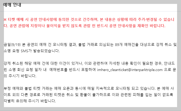 자세한 문의사항은 인터파크 고객센타 1544 -1555 , 고객센타 임영웅 전국투어 ARS 전용1660-1646 으로만 예매절차가 가능한점 참고하시기 바랍니다.