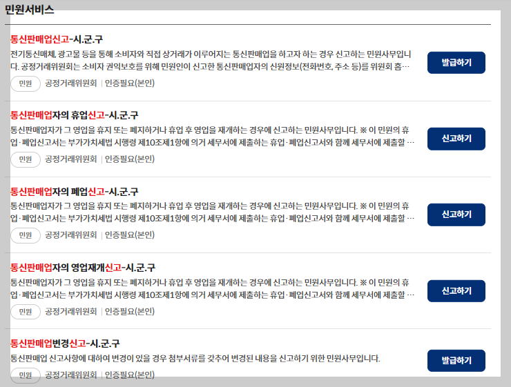 아래와 같이 통신판매업신고, 시군구를 클릭하여 발급해 주시면 아주 간단하게 신청이 가능합니다.